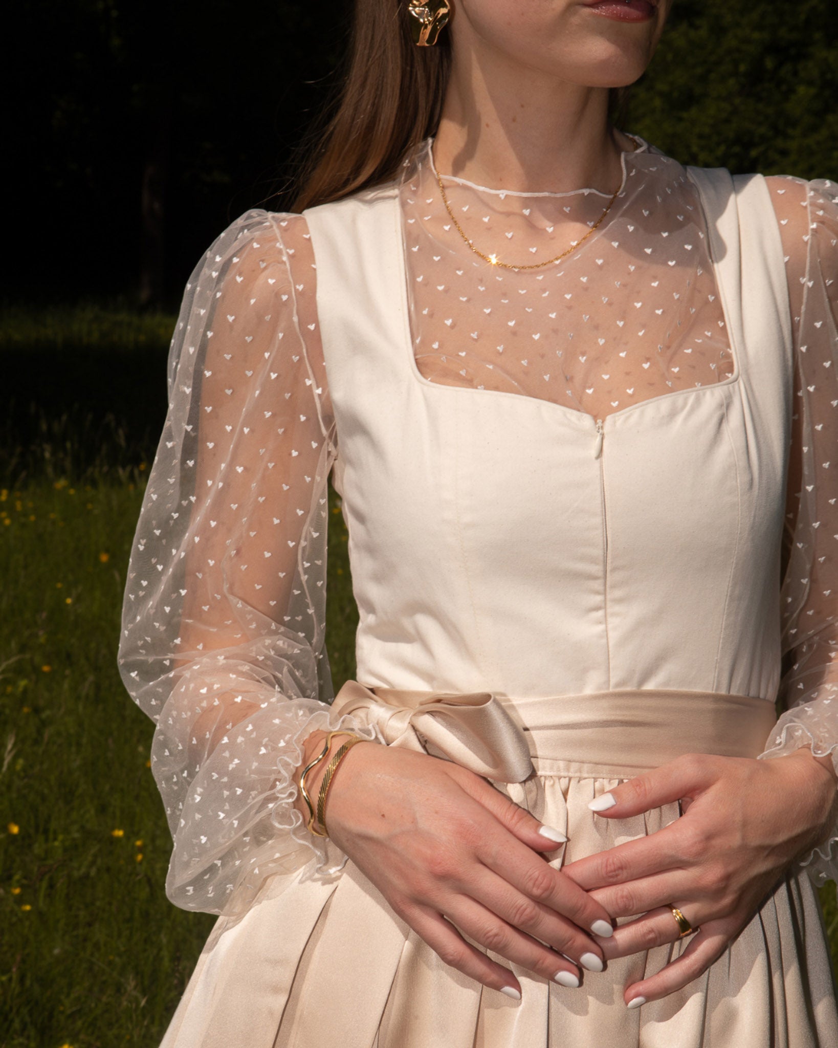 Besonders im Trend: midilange Röcke – wie schon seit Längerem. Um das tiefste Dekolleté geht's zum Glück auch schon lange nicht mehr: hochgeschlossene Blusen mit langen Ärmeln werdet Ihr 2025 oft auf dem Oktoberfest sehen. I promise! Damit's trotzdem cheeky bleibt, setzen wir dieses Jahr bei unseren Dirndlblusen auf transparente, see-through Materialien.