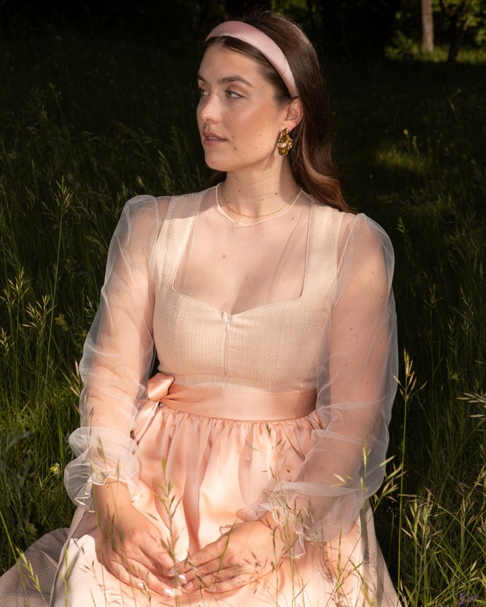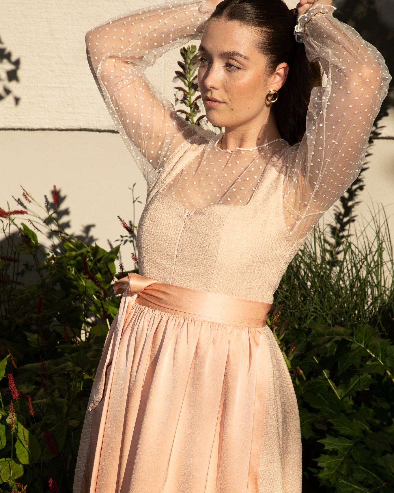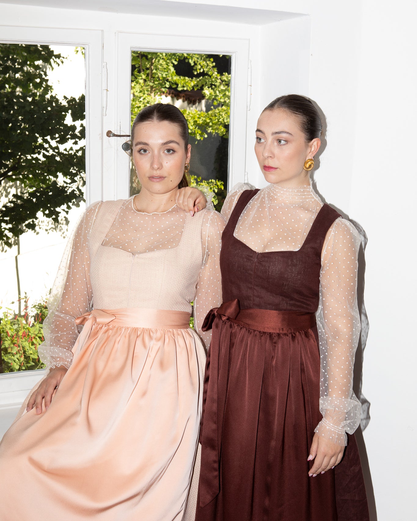 Besonders im Trend: midilange Röcke – wie schon seit Längerem. Um das tiefste Dekolleté geht's zum Glück auch schon lange nicht mehr: hochgeschlossene Blusen mit langen Ärmeln werdet Ihr 2025 oft auf dem Oktoberfest sehen. I promise! Damit's trotzdem cheeky bleibt, setzen wir dieses Jahr bei unseren Dirndlblusen auf transparente, see-through Materialien.