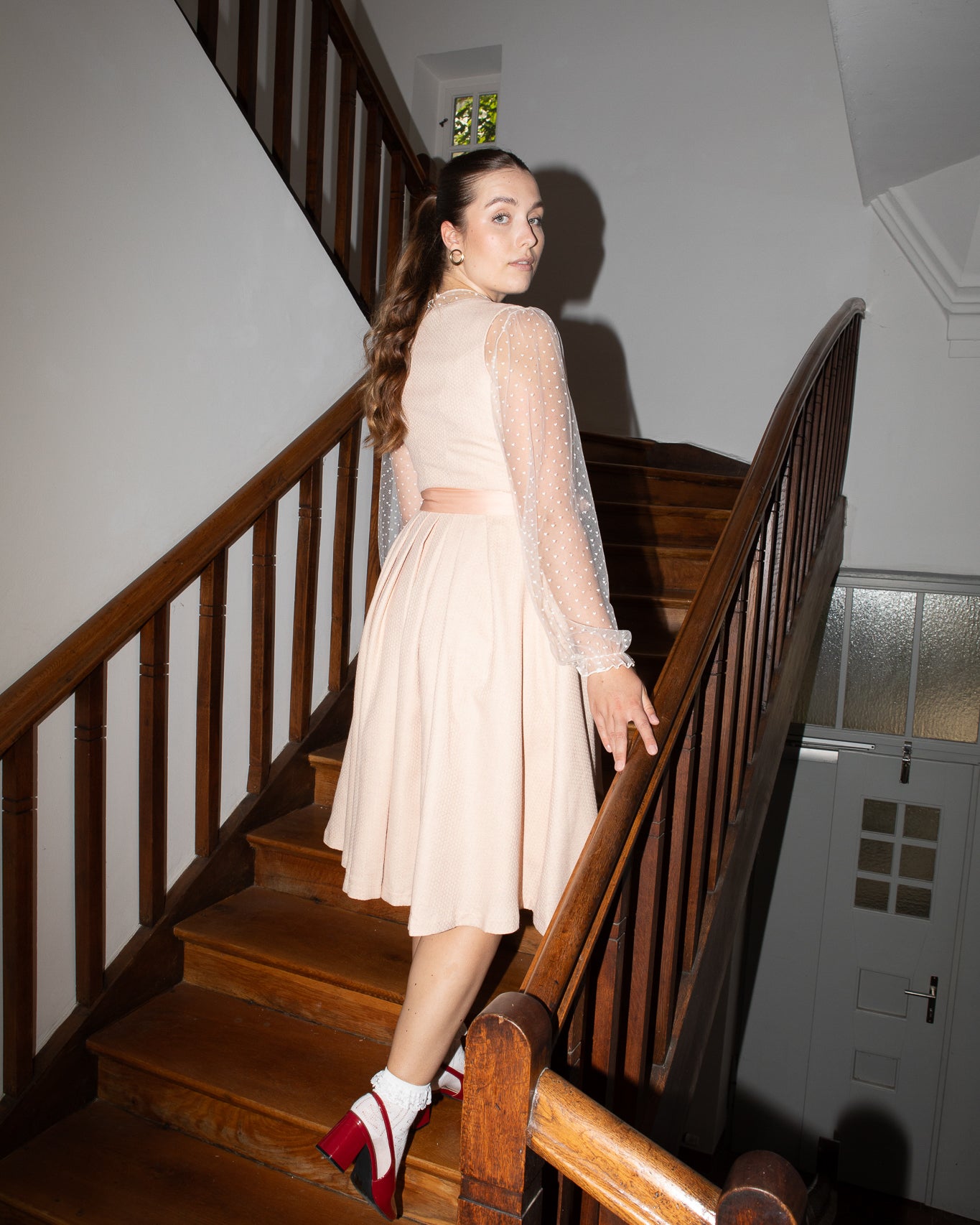 Sommerlich, dezent und fein. Gemacht für unvergessliche Momente. Unser Dirndl Theres vereint sanfte, traumhafte Pastell-Töne mit praktischen Details: Der feine Viskose-Polyester-Stoff fällt schön, das Futter aus 100 % Baumwolle sorgt für Komfort. Mit verstärktem Rock, innenliegenden Taschen und offenliegenden Nähten zum einfachen Weiternähen – für viele Jahre an Deiner Seite.