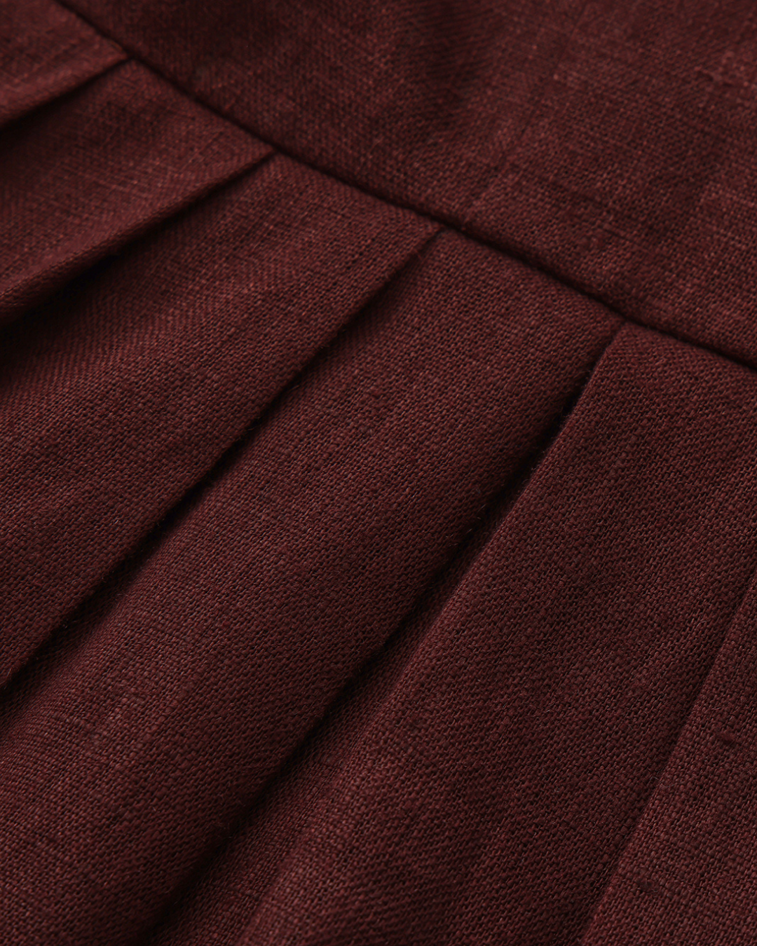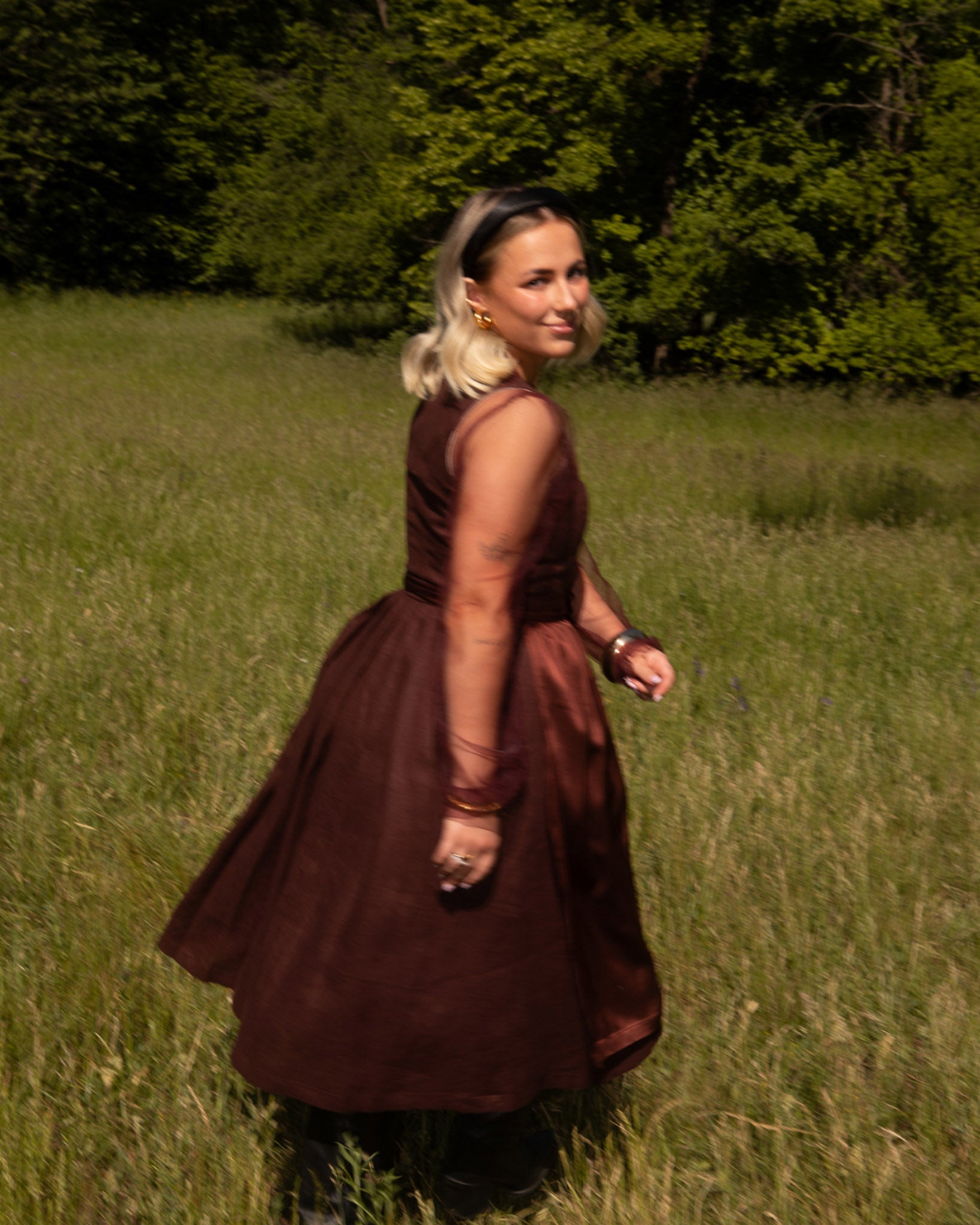 Warm, ausdrucksstark und voller Tiefe: Unser Dirndl Frieda leuchtet in einem kräftigen Burgund – das an die Farbe von Rosenholz erinnert. Die Farbe wirkt klassisch und modern. Der Stoff aus Leinen fällt weich, liegt angenehm auf der Haut und macht Frieda zu einem zeitlosen Begleiter für besondere Tage